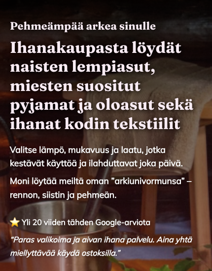 Ihanakauppa.com on kotimainen verkkokauppa, josta löydät naisten lempiasut, miesten suosituimmat pyjamat ja oloasut sekä kodin tekstiilit, jotka tuntuvat hyvältä heti ensikosketuksesta.